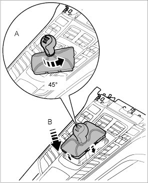 2. Twist sleeve together with lower part of shift-lever knob by 45 degrees in direction of arrow -inset (B)- and release it.