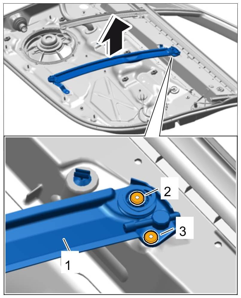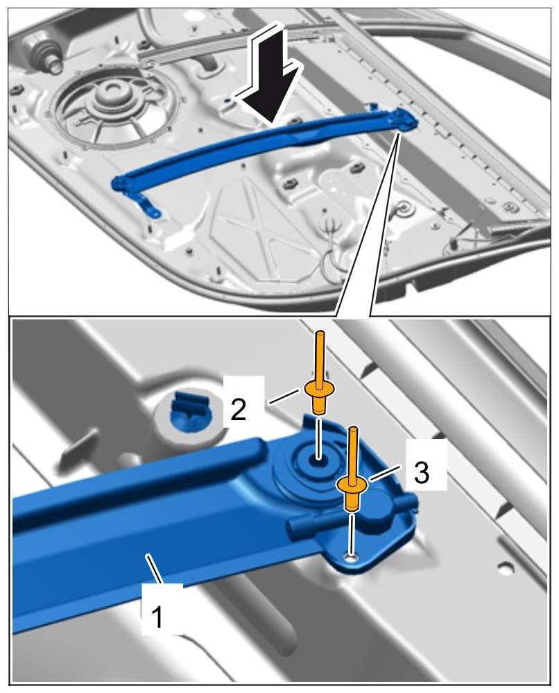 1.4. Rivet in the guide rail -1- at the top fastening point using new rivets -2 and 3-.