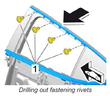 5. Drill out fastening rivets -1- on moulding and remove the remaining pieces of the rivets.