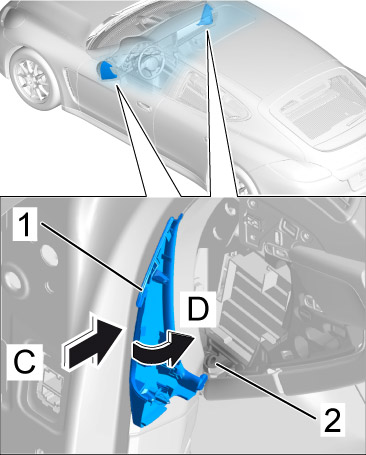 2. Swivel the cover inward and press it in -arrow D- until the retaining clips engage securely.