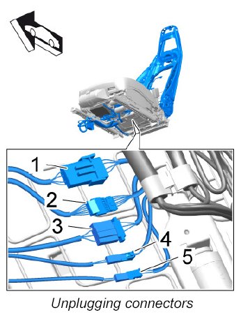 3.3. Unplug plug connections under the seat frame -1 to 5- .