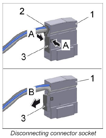 3.9. Release the two single connectors -3- ( -A- ) and remove them from the connector socket -1- ( -B- ).