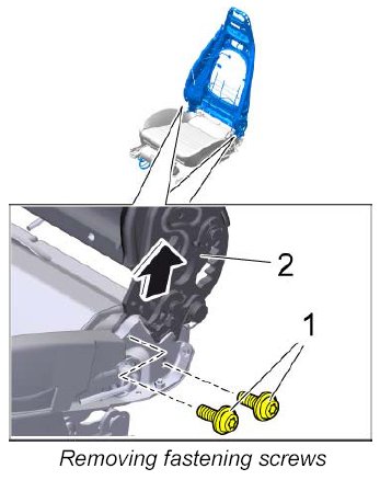 4. Unscrew fastening screws -1- and lift the backrest frame -2- up slightly -arrow- .