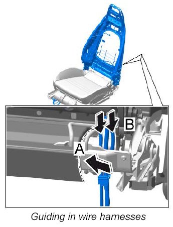 6. Guide the wire harnesses up -B- out of the seat frame.