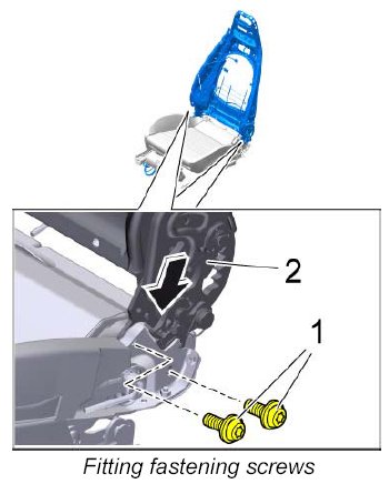 3. Guide the backrest frame -2- in fully -arrow- , screw in the two fastening screws -1- and tighten to the specified tightening torque.