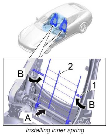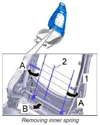 2.2. Unclip inner spring -2- on the backrest frame at the drive shaft -B- and remove inner spring.