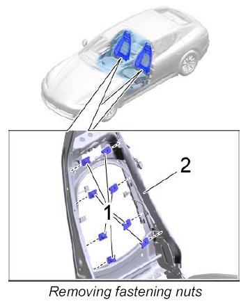 4. Remove fastening nuts -1- from the backrest frame -2- , check them and replace if necessary.