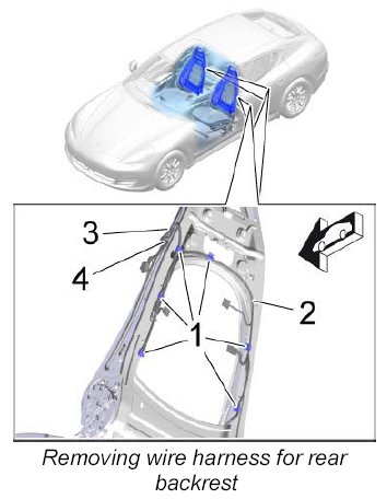 5.2. Remove the holder -3- for the side airbag wire harness -4- and lines from the backrest frame.