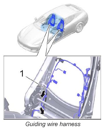 5.3. Guide the rear wire harness -1- down between the backrest and seat surface -arrows- .