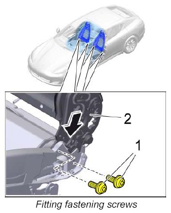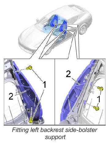 6. Fit left backrest side-bolster support -2- , screw in fastening screws -1- and tighten to the specified tightening torque.
