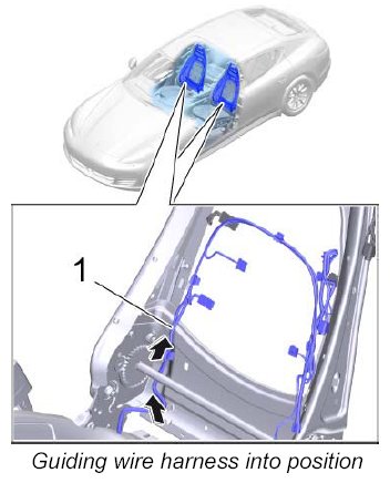 2.1. Guide the rear wire harness -1- up between the backrest and seat surface -arrows- .
