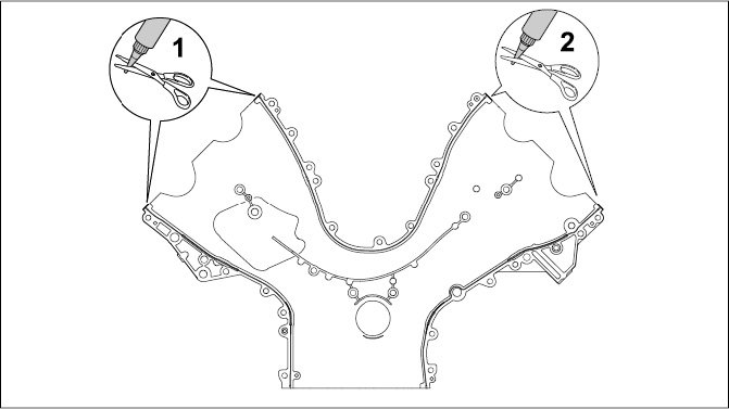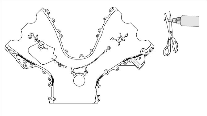Carefully apply Loctite 5900 sealant on the timing chain housing in such a way that sealant cannot get into the screw holes when you fit the timing-case cover. Loctite 5900 can increase the friction coefficient of the aluminum screw. The sealant must not overflow.