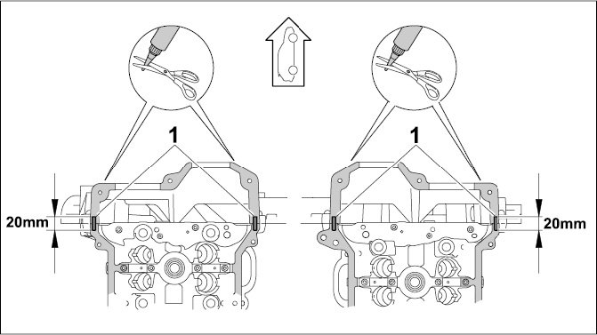 2. Fit the new metal seals on the timing-case cover. Fill the openings in the metal seals with sealant. Apply sealant at the specified markings on the engine. Apply the sealant in such a way that no excess sealant can expand into the engine when the timing-case cover is fitted (blocked oil ducts).
