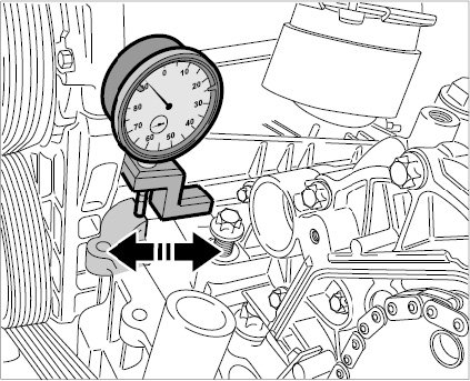 3. Measure offset. To do this, push with the bracket starting from the lower part of the crankcase towards the timing-case cover (the base of the dial gauge bracket is not located on the same component as the dial gauge probe) and measure the offset. The timing-case cover must not be set back by more than 0.1 mm. Even the slightest projection must be corrected.