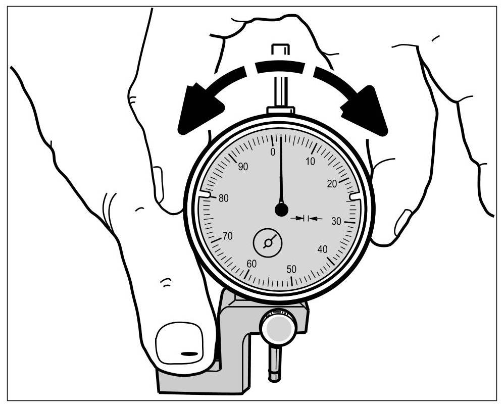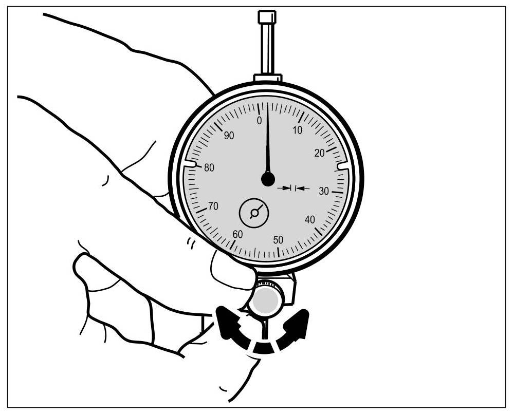 2. Set dial gauge scale to 0. To do this, place the dial gauge bracket on a completely flat surface (e.g. crankcase flange) and turn the dial gauge scale until the pointer is at 0. => Resetting dial gauge scale