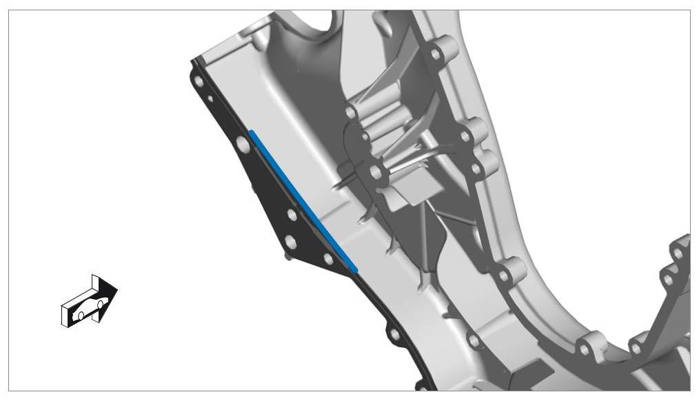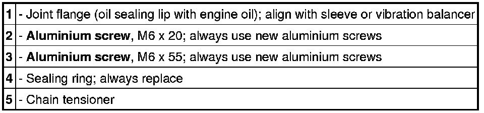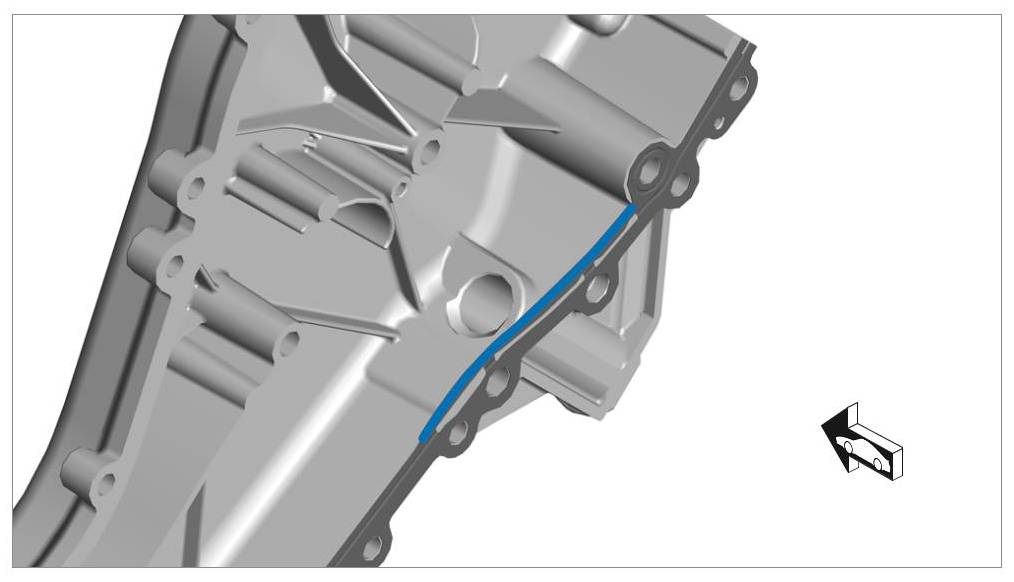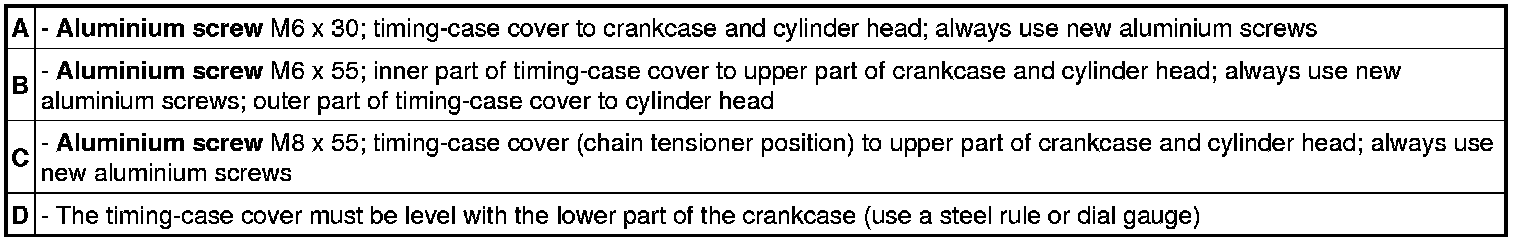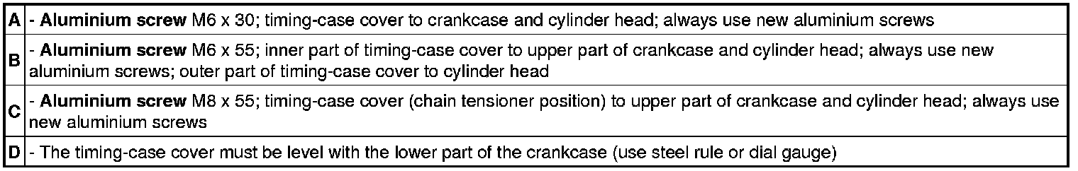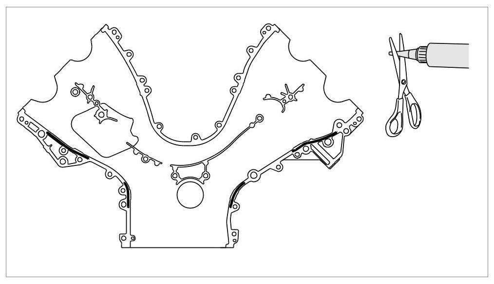 Carefully apply Loctite 5900 sealant on the timing chain housing in such a way that sealant cannot get into the screw holes when you fit the timing-case cover. Loctite 5900 can increase the friction coefficient of the aluminium screw. The sealant must not overflow.