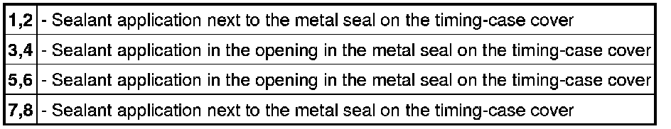 2. Fit the new metal seals on the timing-case cover. Fill the openings in the metal seals with sealant. Apply sealant at the specified markings on the engine => Applying sealant (filling openings in metal seal with sealant) => Timing-case cover seals. Apply the sealant in such a way that no excess sealant can expand into the engine when the timing-case cover is fitted (blocked oil ducts).