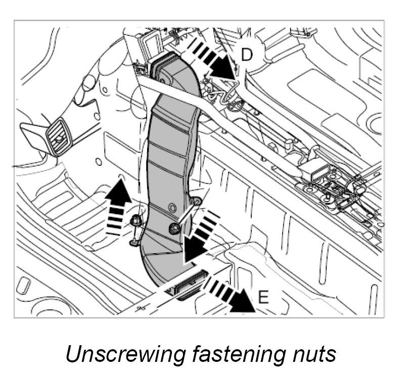 5. Disconnect the rear air guide at the front from the air conditioning unit -arrow D- and lift the air guide holders out of the bolts.