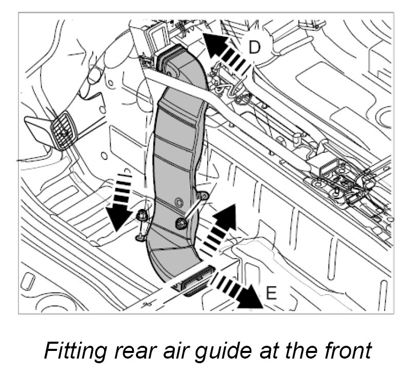 3. Guide the rear air guide at the front into the rear air guide at the centre -arrow E- and lock it securely.