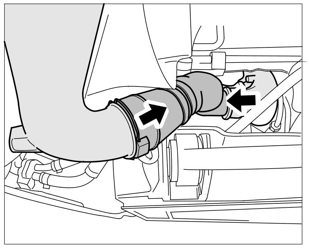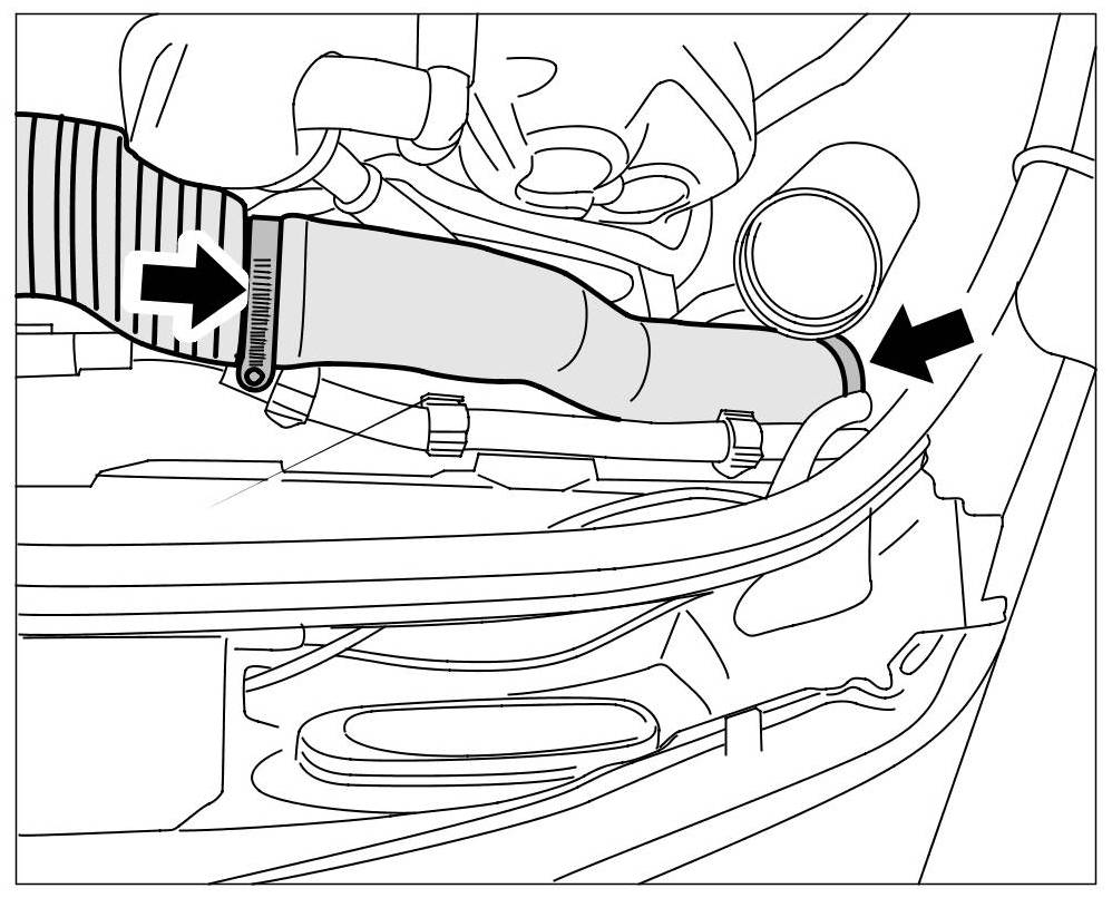 1. Remove the charge air line at the left between the charge air cooler and the air box for the throttle valve.