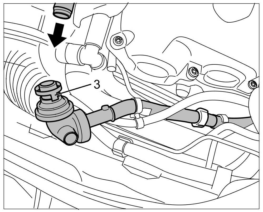 11. Clip in the positive crankcase ventilation line -3- at the left, beside the throttle valve, underneath the engine cover (design cover).