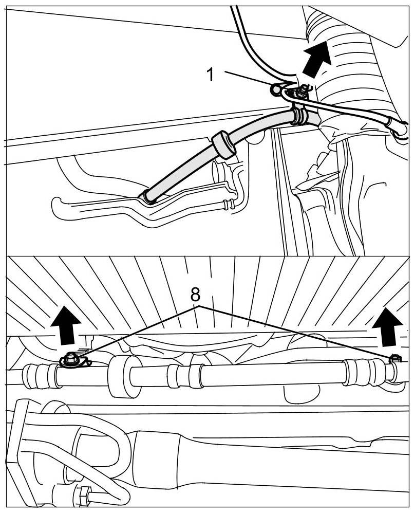 8.3. Unscrew the fastening nuts -8- on the line bracket on the steering gear.