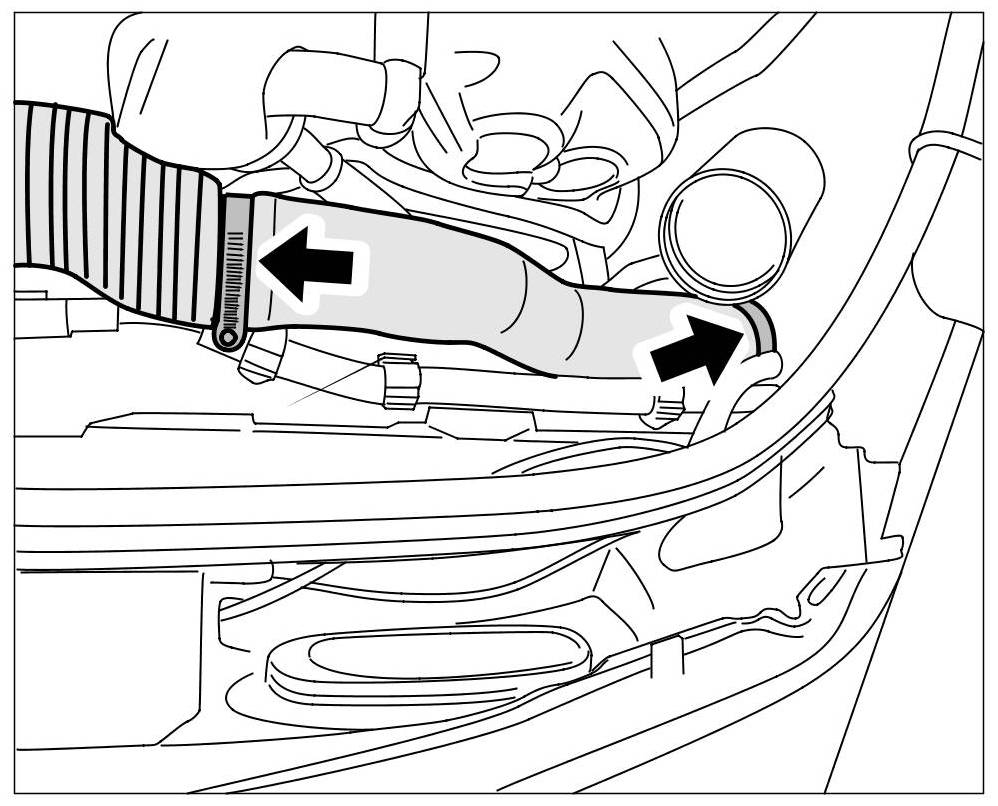 7. Fit the charge air line (in the left wheel housing) together with the positive crankcase ventilation hose. To do this, pull the complete vent line in the assembly through in an upward direction. -> 1052IN Information on positive crankcase ventilation (full-throttle ventilation) - section on "Information" Service and Repair
