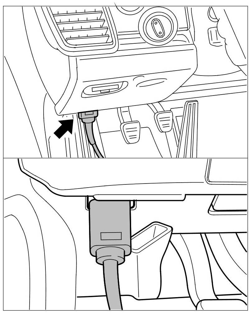 The PIWIS Tester II 9818 is connected to the vehicle via a diagnostic socket. The diagnostic socket is located inside the vehicle close to the driver's A-pillar below the instrument panel.