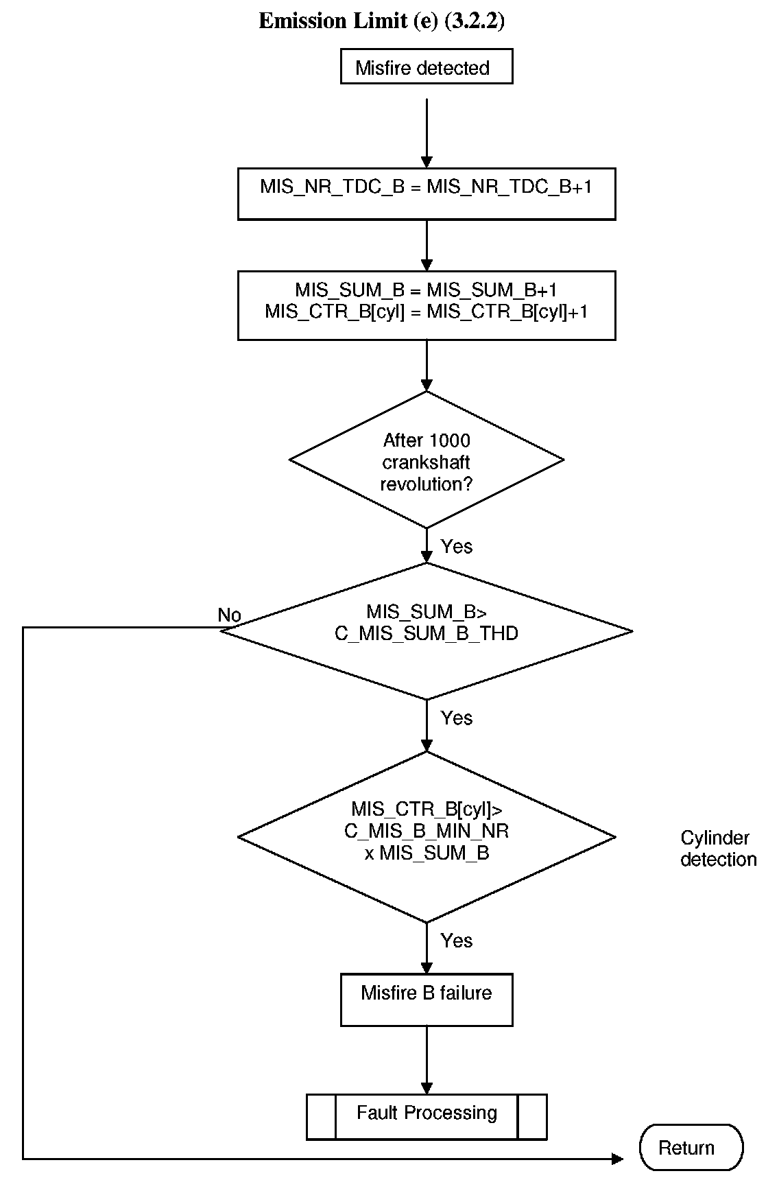 If the sum of cylinder(s) misfire counters within 1000 revolutions is 4 times exceeding a predetermined value during a driving cycle, or during the first 1000 revolutions, the fault code for emission relevant misfiring is temporary stored. If the following driving cycle is also above the emission limits, the MIL will be switched on and a cylinder selective or global fault will be stored.