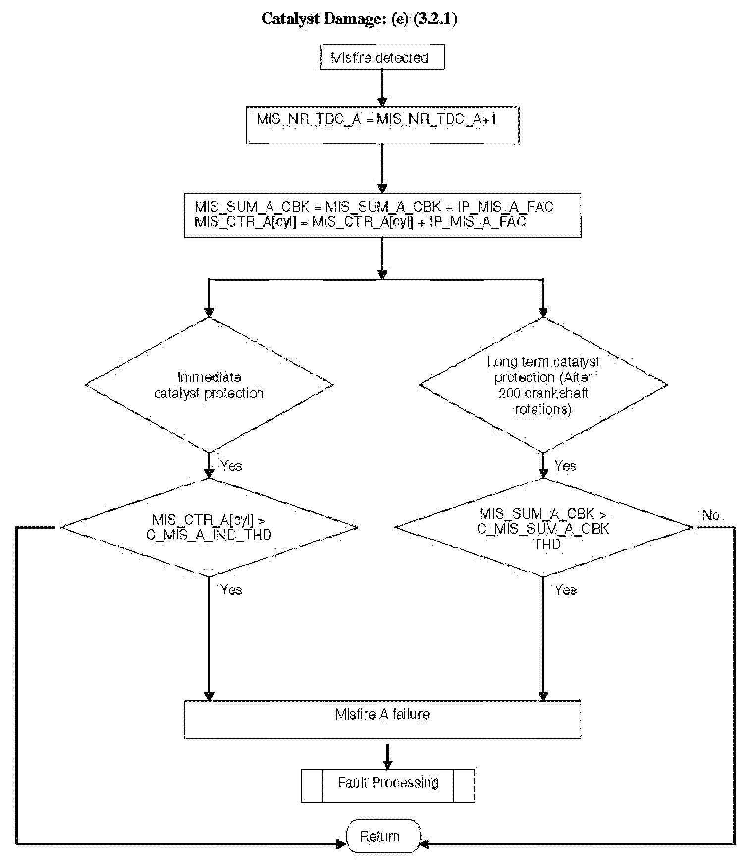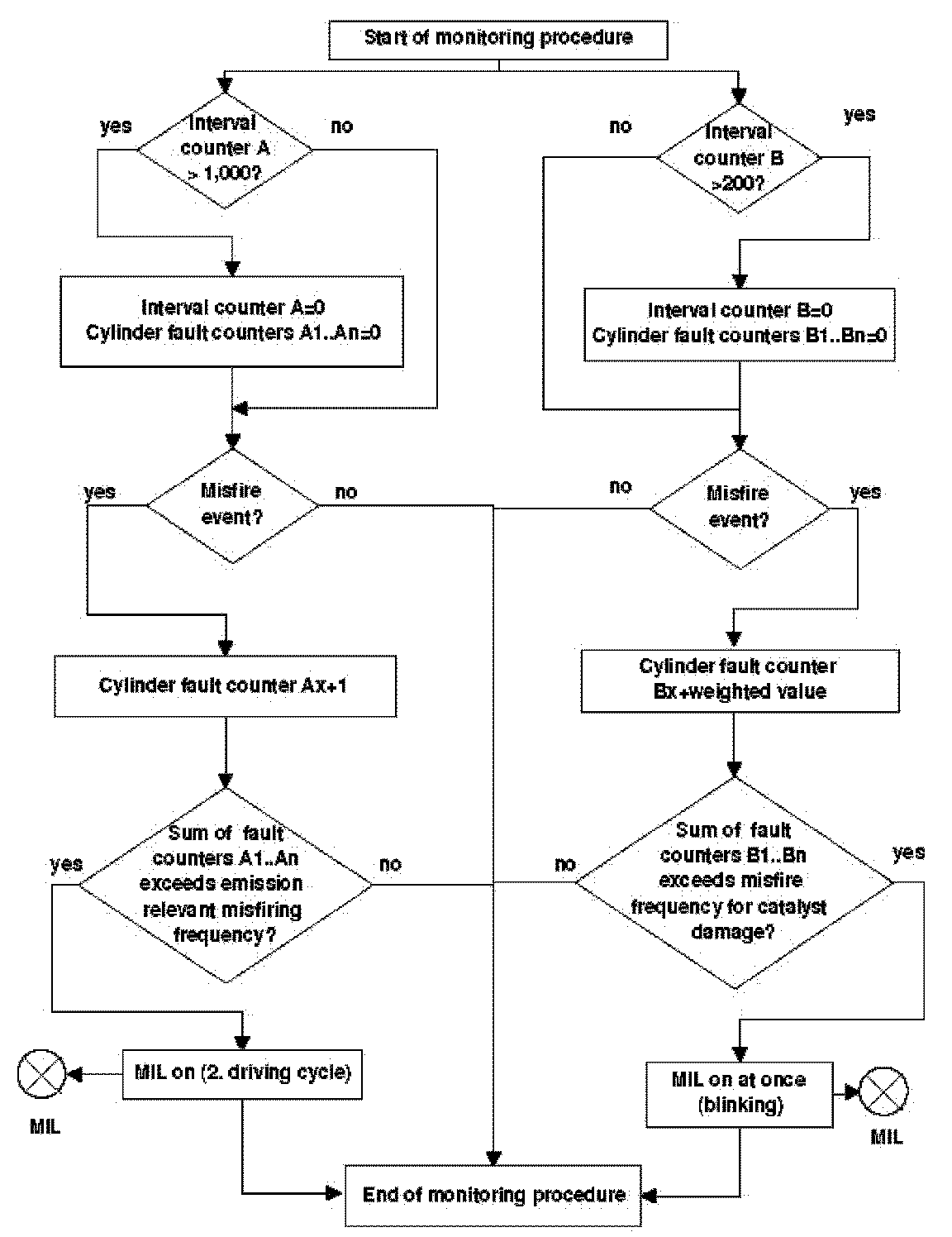 If the weighted sum of individual cylinder(s) misfire counters within 200 rotations is exceeding a predetermined value, or the weighted sum of misfire counter per bank exceeds a predetermined value at the end of 200 rotations, then the fault code for catalyst damage relevant misfiring is stored and the cylinder with the highest rate will be switched off, and the MIL will be switched on immediately.