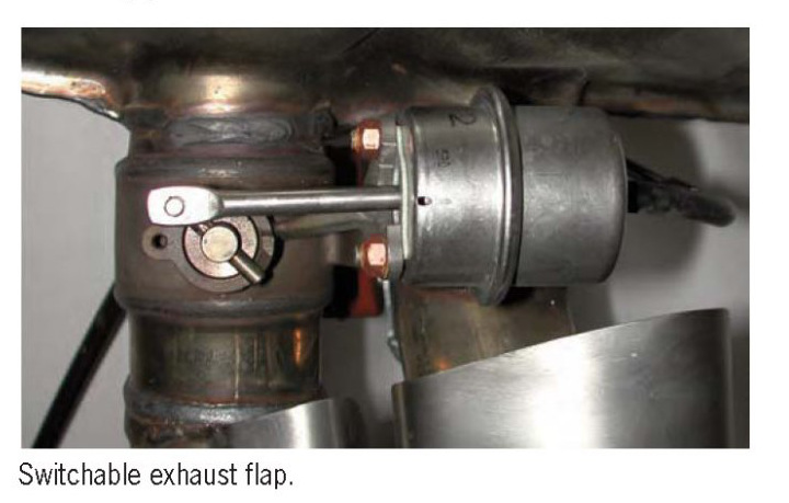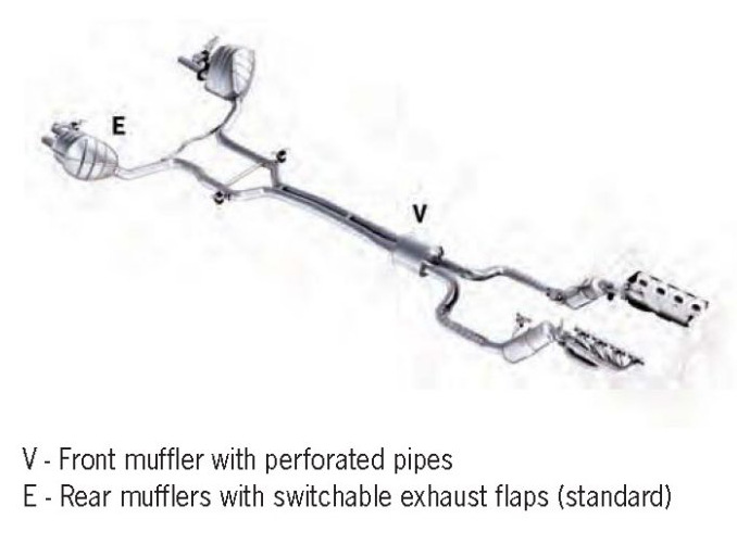 The exhaust system of the V8 turbo engine automatically switches between two operating states: as a result, there is a low noise level in the lower rpm range, and this increases in the high rpm range and at full throttle due to improved throughput. The improved throughput is achieved by opening the exhaust flaps located on one of the two exhaust pipes between the rear muffler and tailpipe cover in each case. This opens the second exhaust pipe in each muffler.