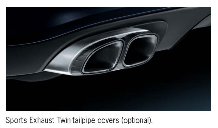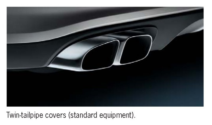 The exhaust emissions leave the Panamera Turbo through two twin tailpipes in matt silver which differ in design from the tailpipes of the V8 naturally aspirated engine. Unlike the tailpipes of the Panamera S/4S, these tailpipes are rectangular. Optimum sound is achieved in all engine speed ranges through specific insulation and pipe routing in the rear muffler as well as by means of specially designed tailpipes.