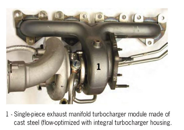 A single-piece exhaust manifold turbocharger module made of high-temperature-resistant cast steel without intermediate flange has been realized for the first time for the Porsche V8 engine.