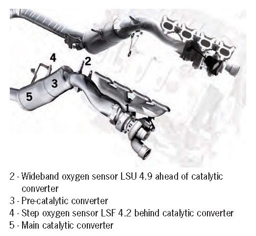 The cylinder bank-specific LSU oxygen sensors ahead of the catalytic converter and LSF oxygen sensors behind the catalytic converter signal the exhaust gas composition to the DME control unit. The DME control unit can then use this information for targeted intervention in bank-specific mixture control. This ensures that the strictest emission standards are met or even bettered - for the Panamera Turbo: EU 5 in Europe and LEV in the USA.