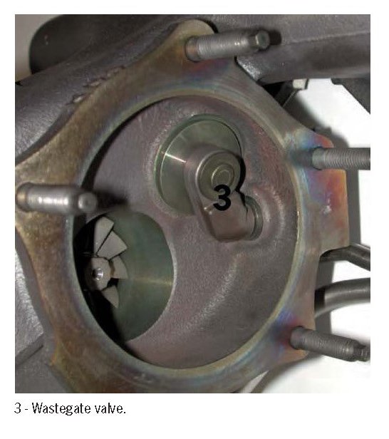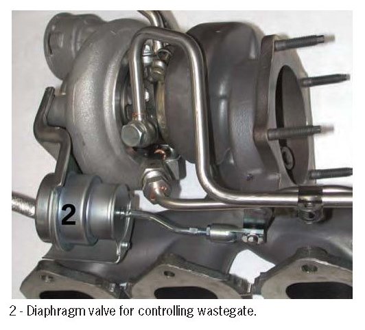 The DME control unit regulates the boost pressure by activating the electric boost pressure control valve (installed on the left next to the electronic accelerator). This modulates a corresponding control pressure onto the diaphragm cell (2) for activating the wastegate valves (3) on the turbochargers.