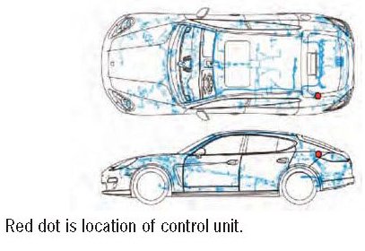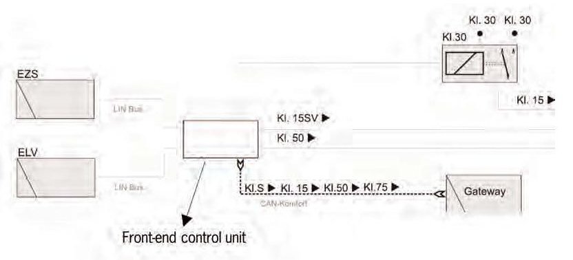The front-end electronics control unit is located by instrument panel/steering wheel and is connected directly to CAN comfort. The control unit delivers the supply voltage for the ignition lock and the axle height sensor via output terminals 30.