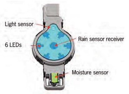 This sensor detects quantities of rainfall and issues a wipe request for the windscreen wiper. The sensor is attached to the windscreen near the rearview mirror.