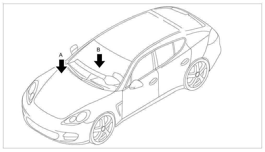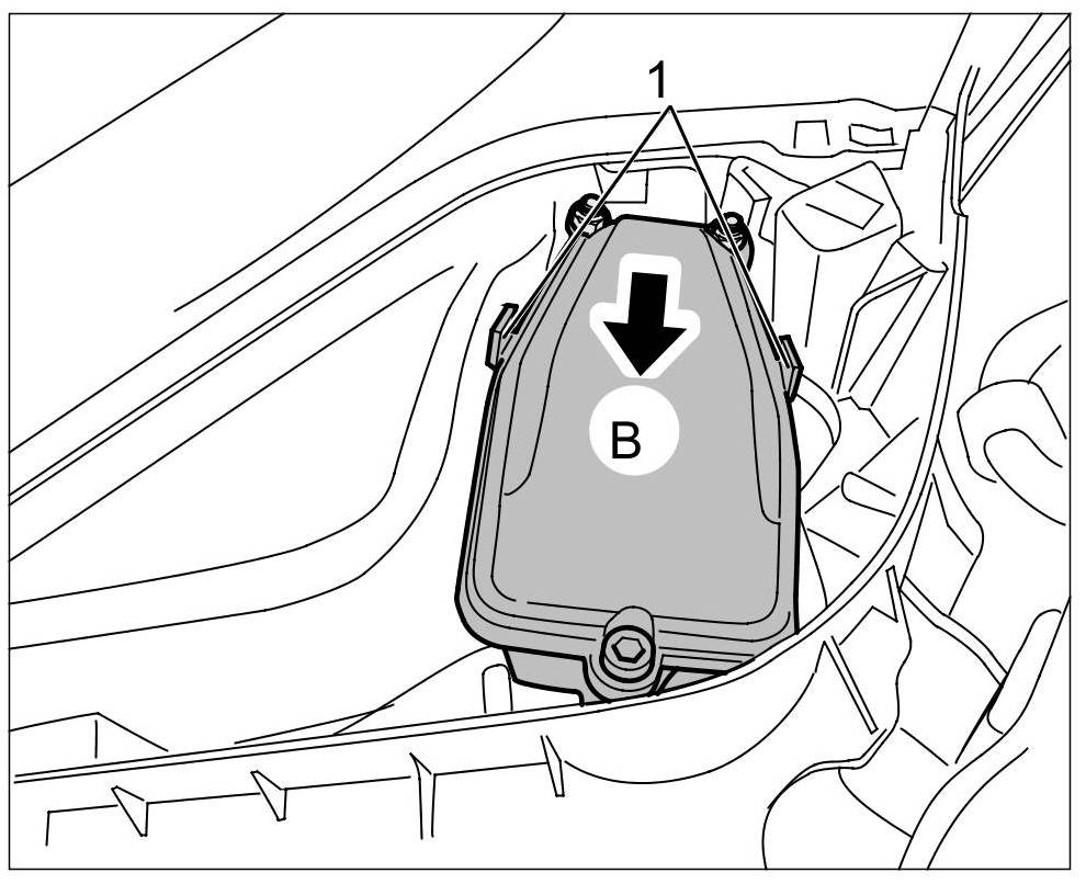 1.2. Press down on relay carrier in engine compartment -arrow B- until retaining clips -1- engage securely.
