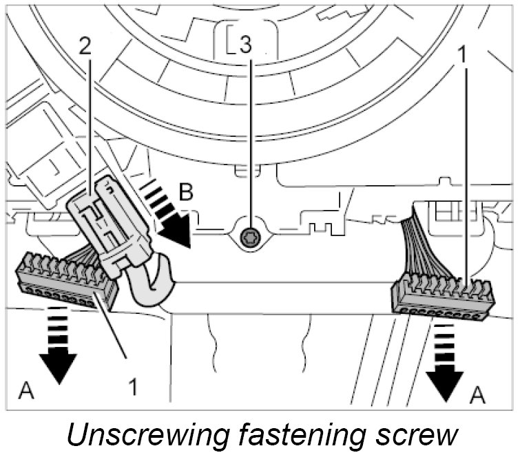 6. Remove the control unit -2- from the steering column switch -3- ( -B- ).