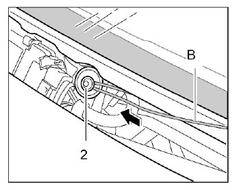 5.1. Attach the loose end of the cutting thread -B- firmly at a suitable point on the body with the fastening screw -2- of a component (e.g. wiper motor fastening). To do this, unscrew the fastening screw, wind the cutting thread -B- around the screw and tighten the fastening screw again.