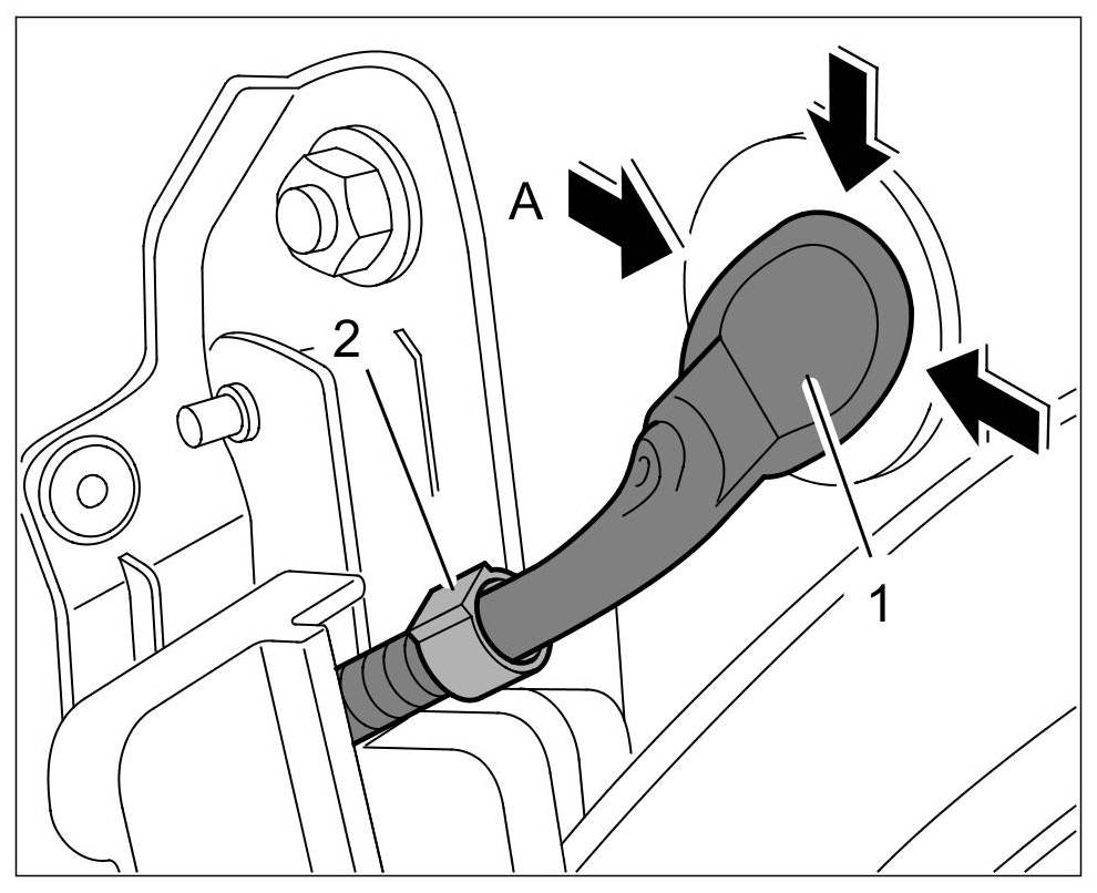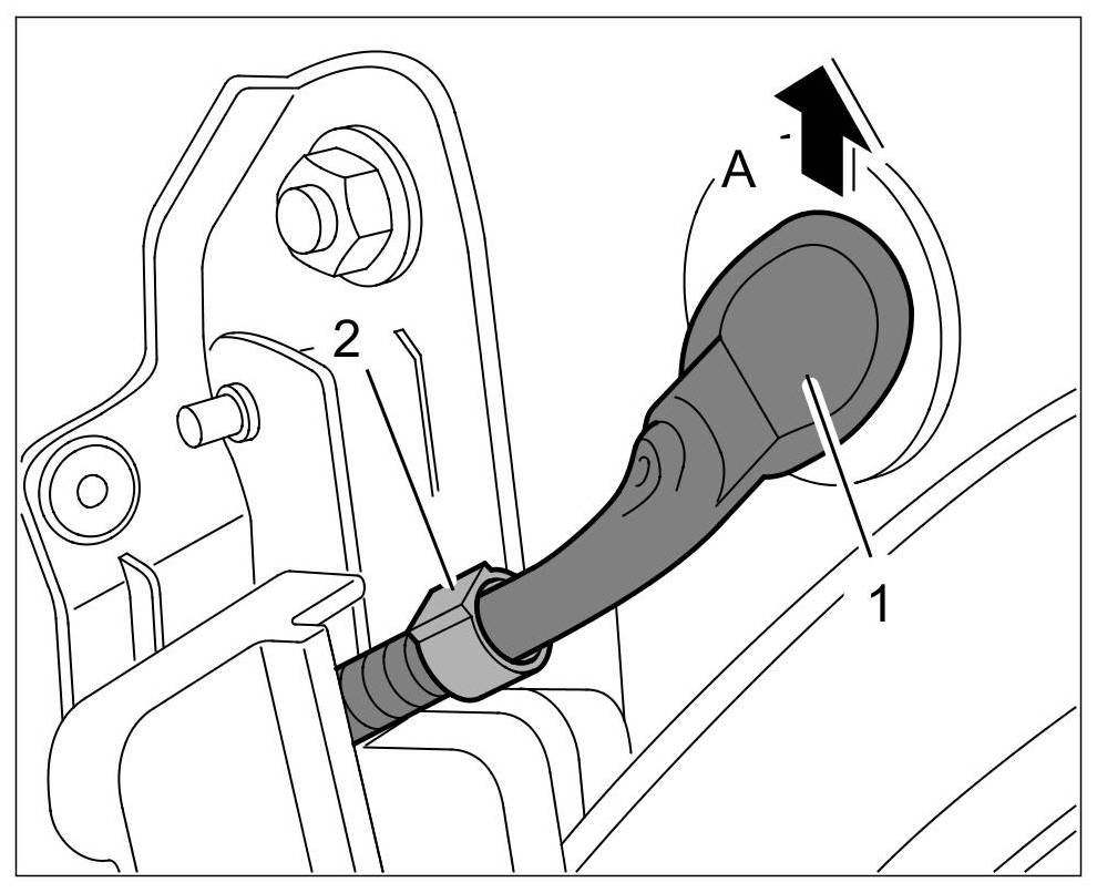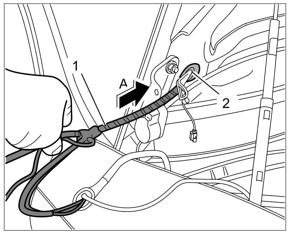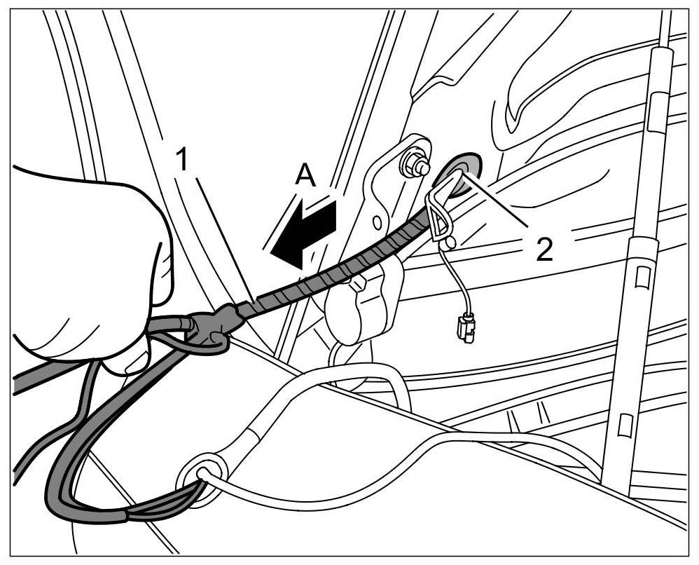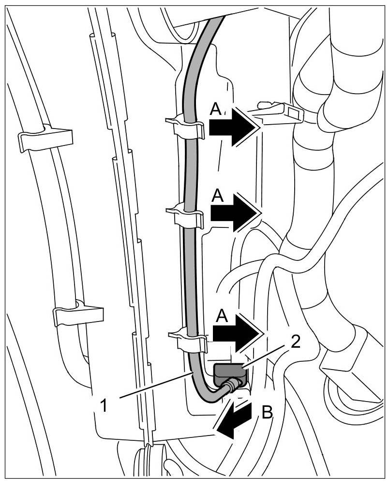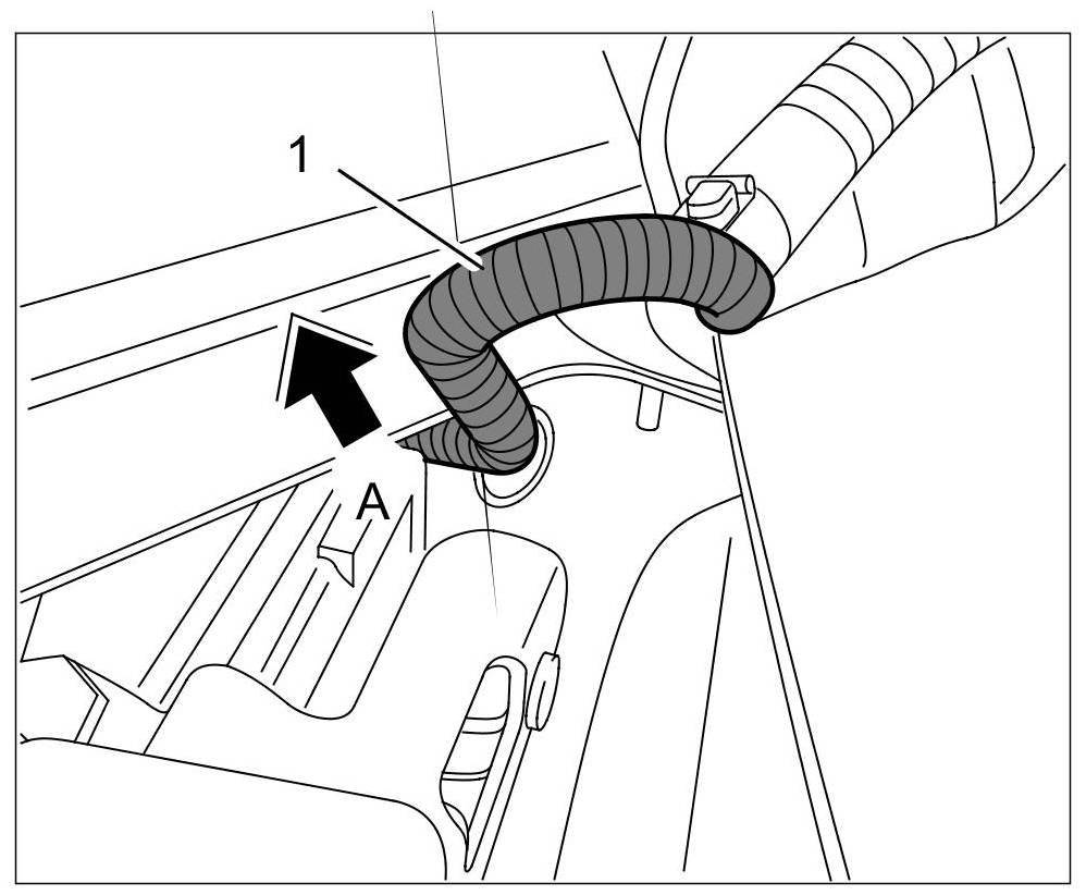 2. Press hose -1- between the wing and plenum panel upwards -A-.