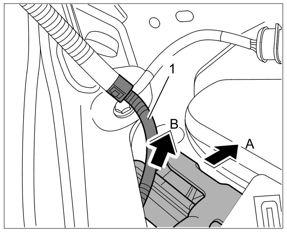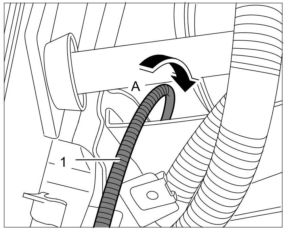 4. Guide the hose -1- for the reservoir for the windscreen washer system downwards -A-.