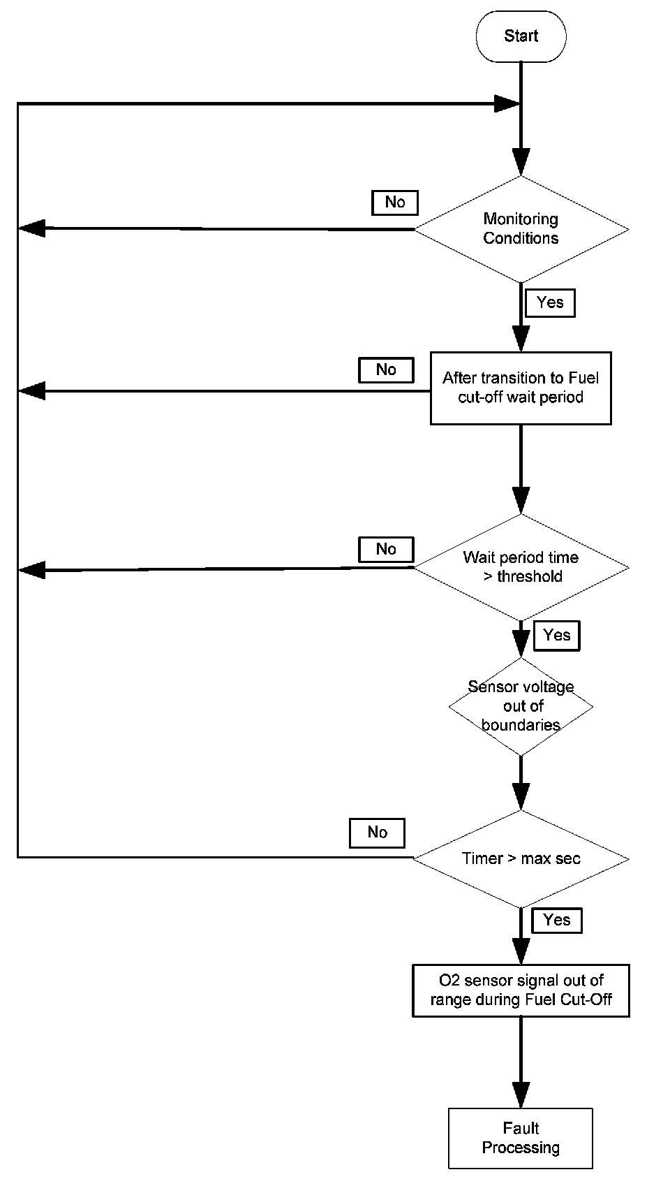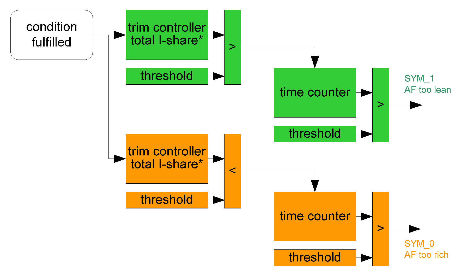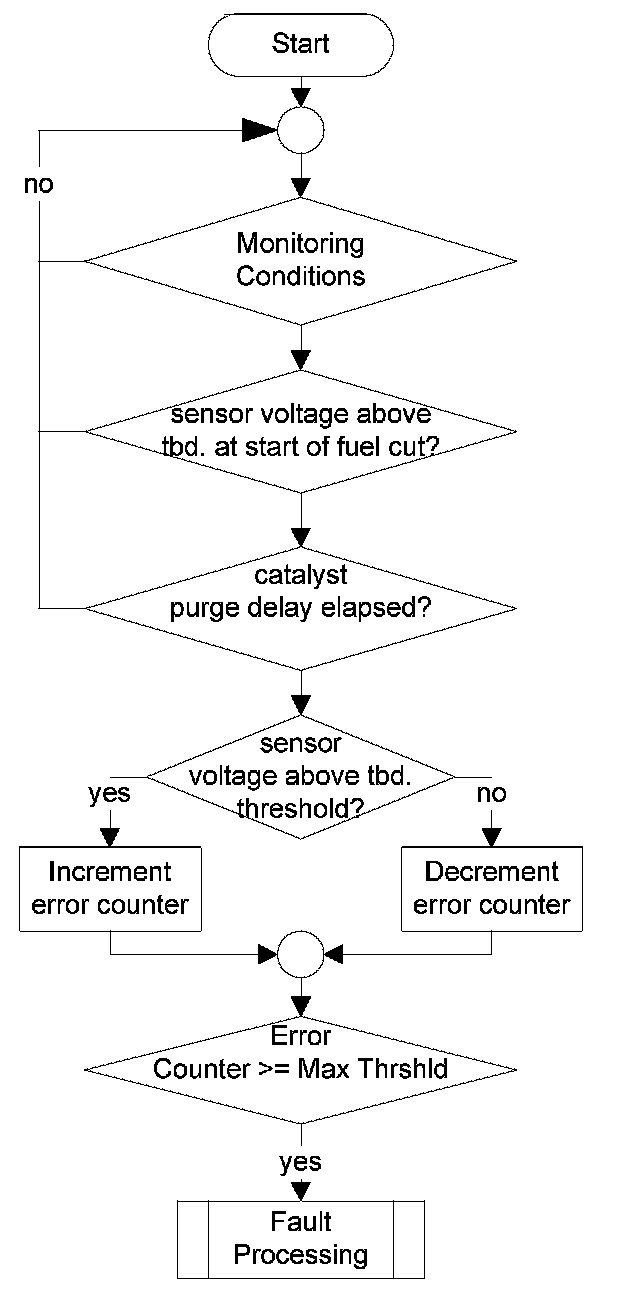 1. Part one monitors the downstream sensor voltage during active fuel trim controller p-share. If the fuel trim control is active, the downstream sensor voltage must be in a band around the trim control set point. If the voltage is outside this band, a mass air flow integral is incremented. If this integral is over a threshold, a malfunction is detected (see also picture below.). When the downstream sensor voltage will not switch to rich before the integral is over a threshold after a fuel cut-off phase, then this fault will be stored, too.