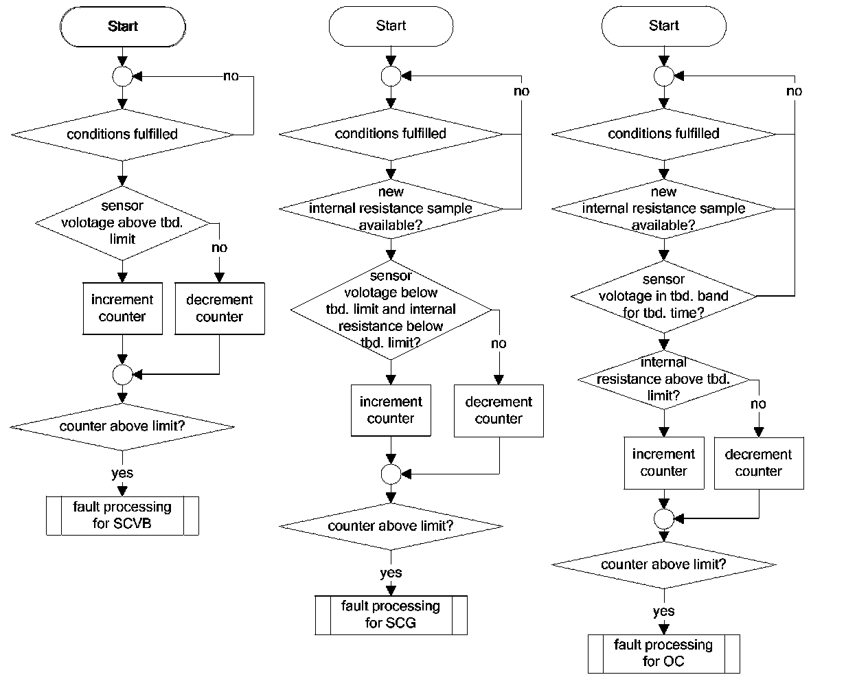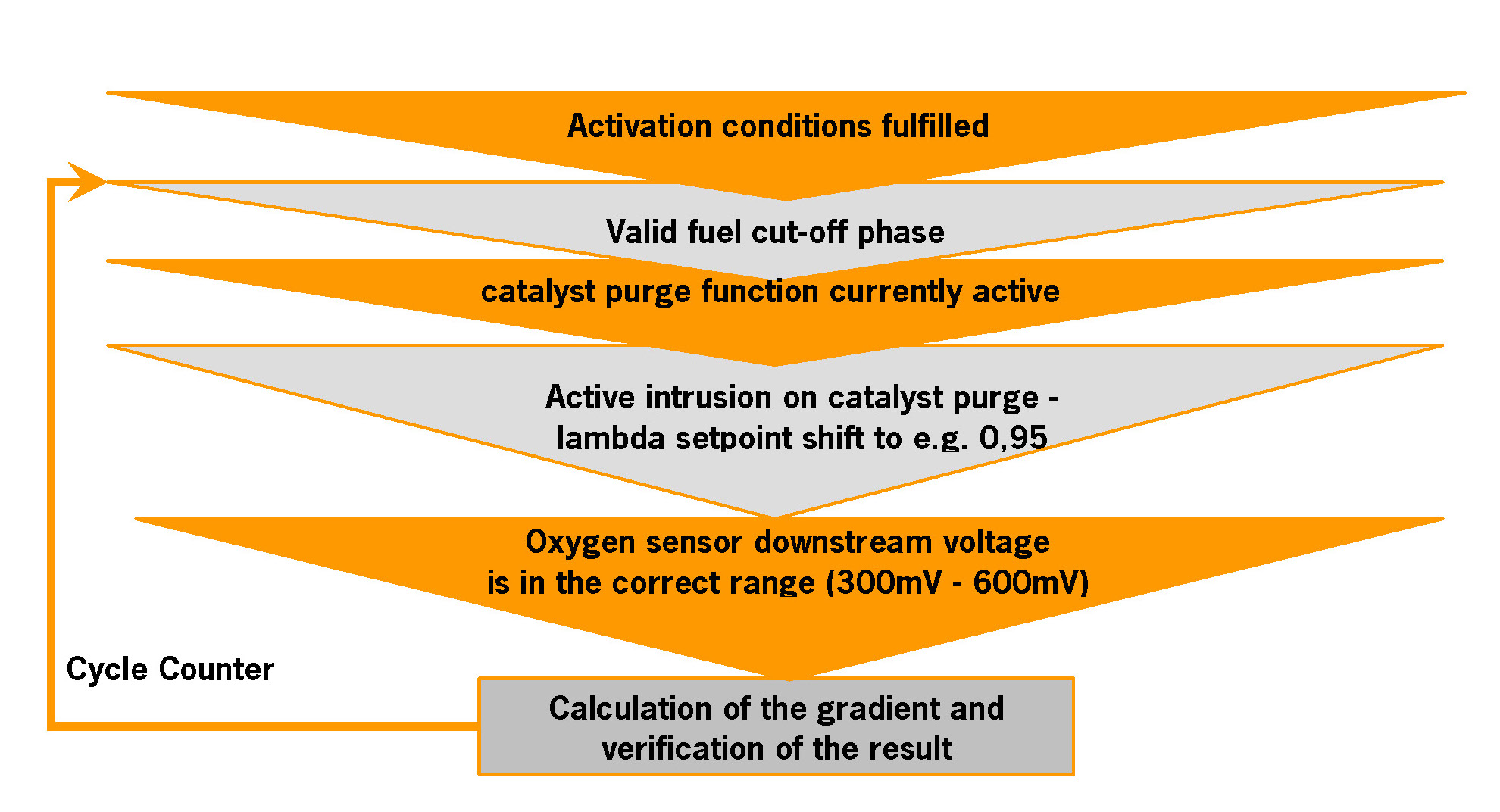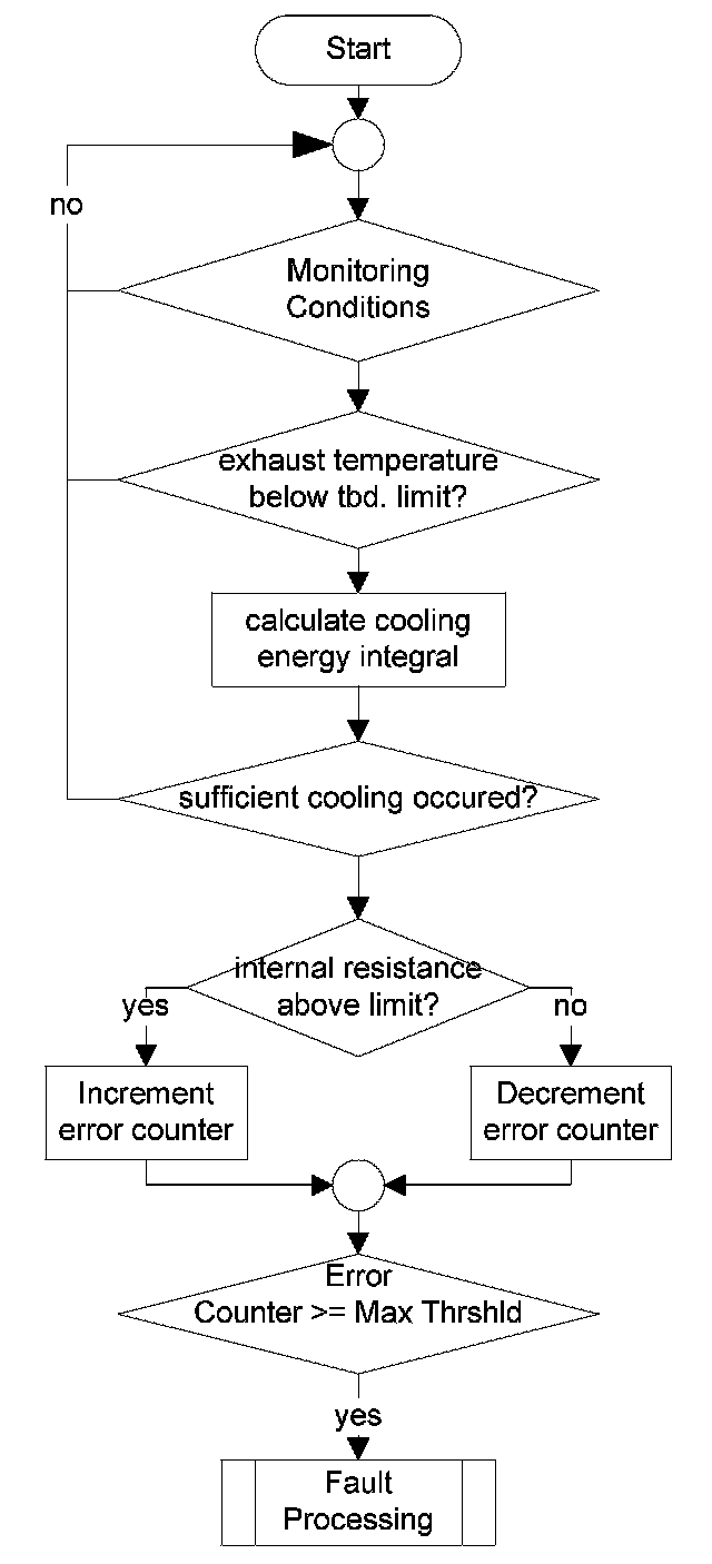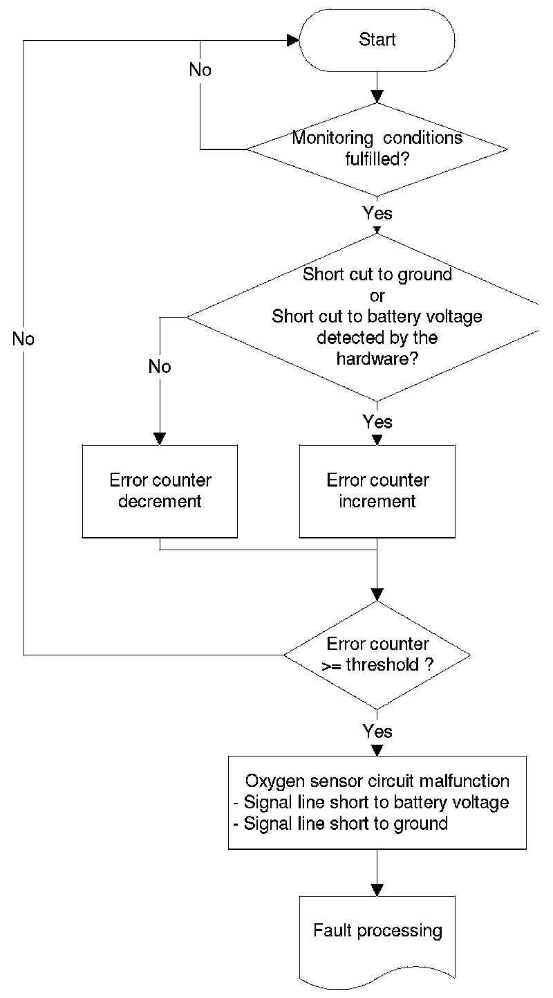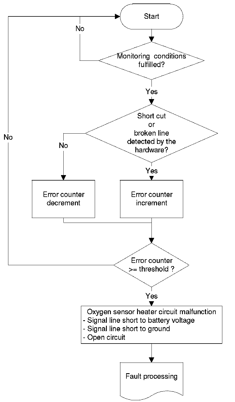 3. the sensor is not heated properly at all (temperature below 650 °C) ---> the "error counter" will be incremented by steps of twenty till it reaches 2000 ---> an error will be stored. In this specific case, the error will be detected in a faster time period. After the decision is made, the diagnosis is running nevertheless continuously.