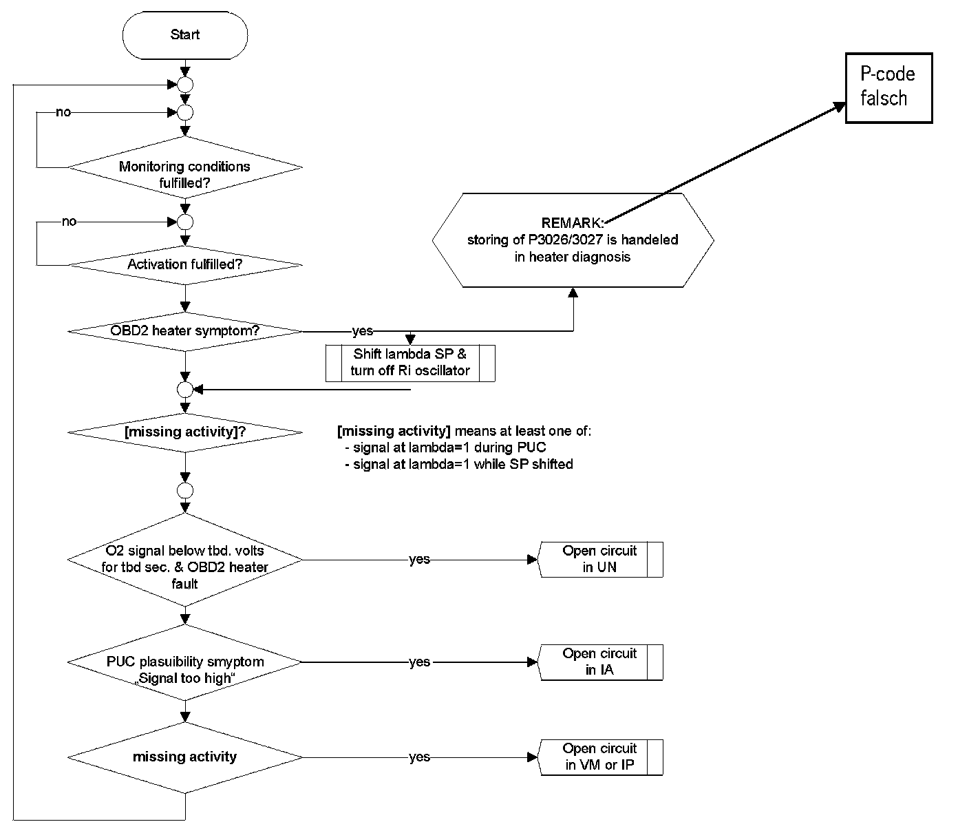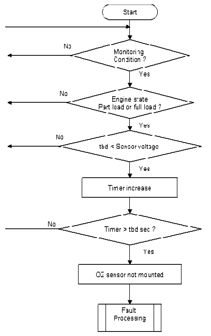 An open circuit in line Virtual Ground or in the line Pumping current can be detected if the sensor signal sticks near lambda 1. The sensor non-activity can be detected by the Oxygen Sensor Signal Monitoring During Fuel Cut-off (signal voltage below e.g. 2.1 V) in fuel cut off or WRAF sens activity check.