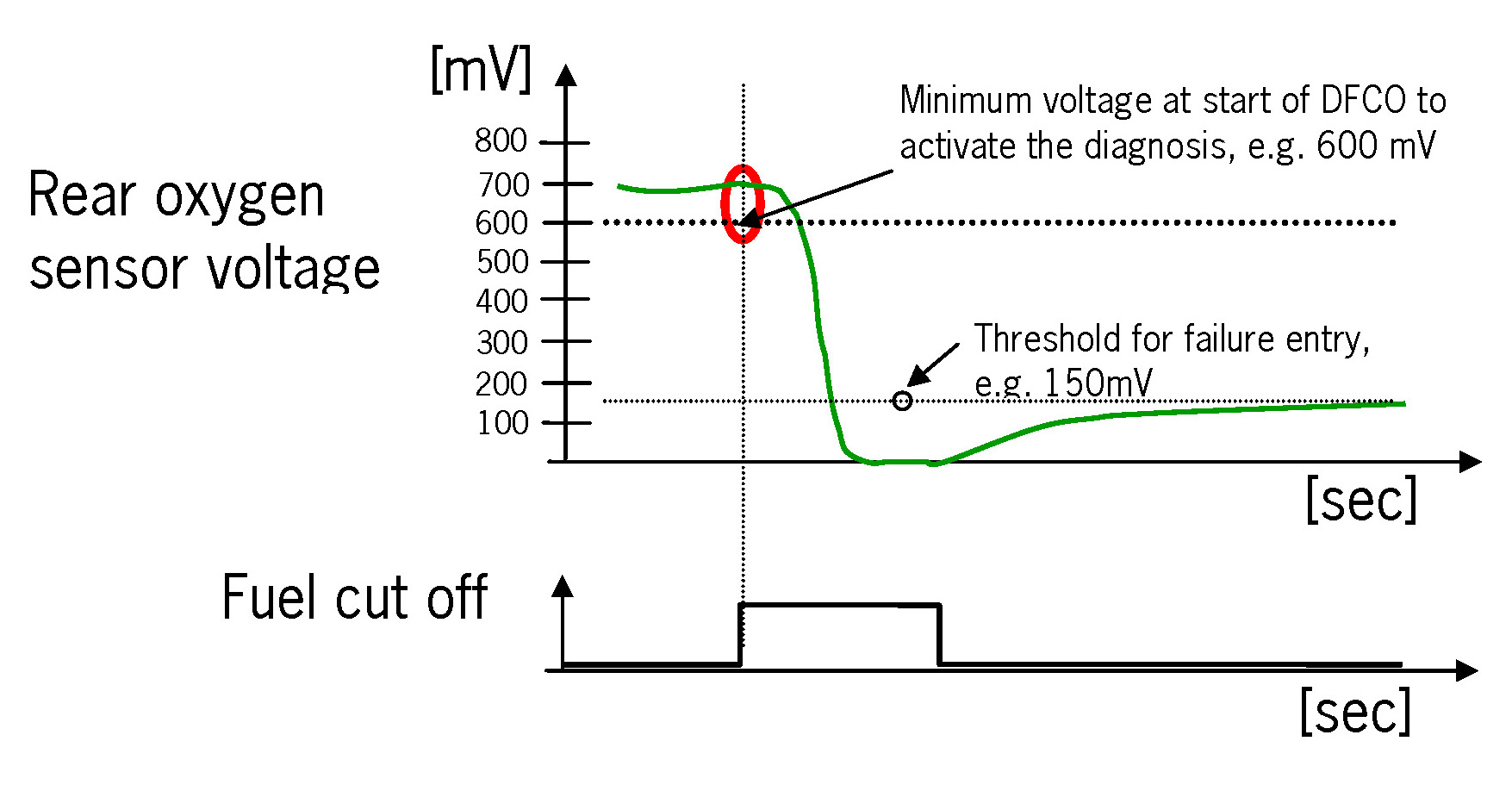 The oxygen sensor signal monitoring during fuel cut-off detects if the oxygen sensor signal is not plausible during fuel cut-off. A malfunction is detected if the oxygen sensor voltage is outside the normal operating voltage range (e.g. 3.1 V ... 5.68 V).)