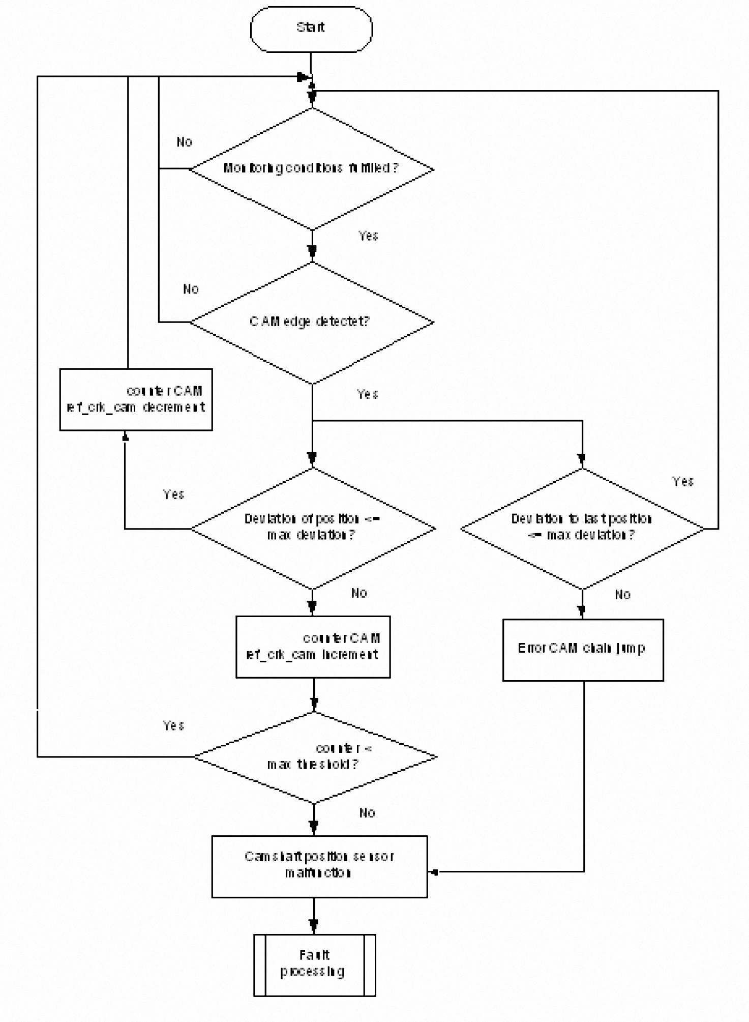 The monitor checks at least once per driving cycle the position of the camshaft in reference position compared to the crankshaft position. The deviation of all camshaft edges compared to the designed position is averaged. If the average value exceeds a max value, the corresponding counter is incremented. When the counter reaches a threshold the error CAM_ref_crk_cam is delivered to the error management.