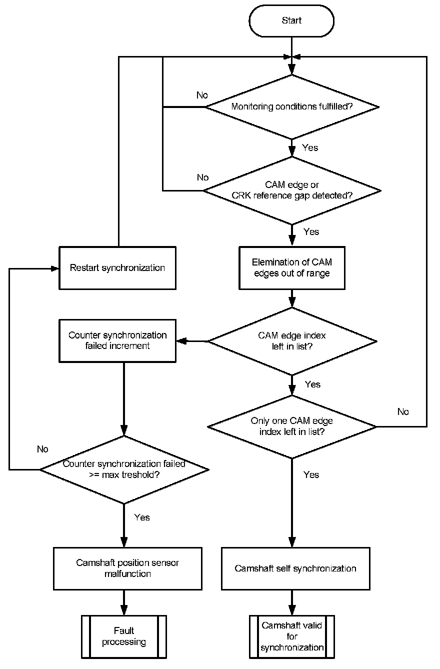 The monitor eliminates with every event the edges from the list of all 8 cam edges, which are not insides the pattern. If only one edge is left, the edge number is identified and the camshaft is valid for synchronization. If no edge is left in the list, synchronization failed and is started again. If a calibrated number of synchronizations failed, the error is delivered to the error management. Afterwards, and only if synchronization fails with the intake camshaft.