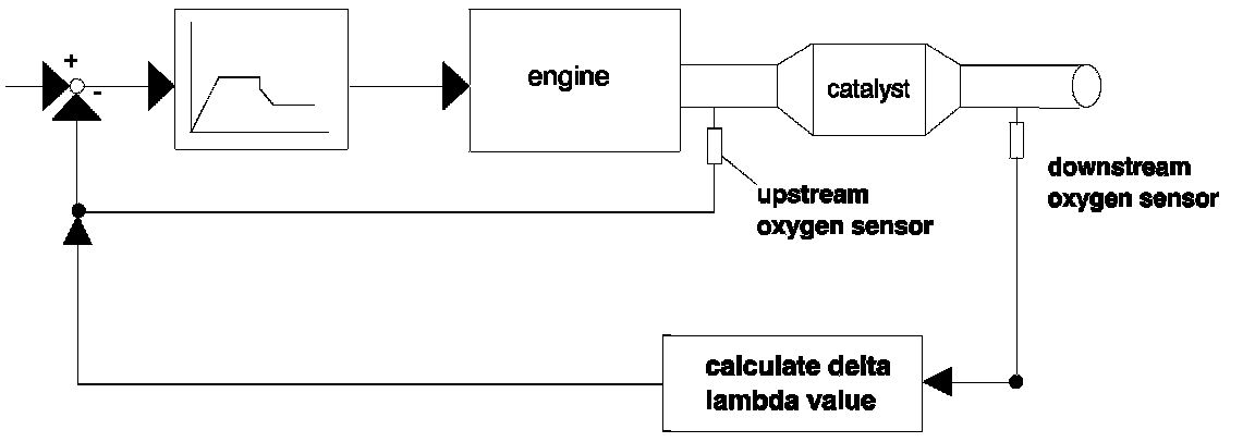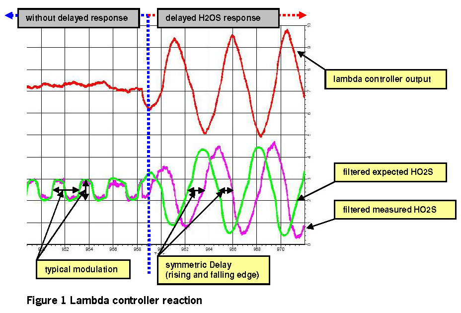 - At the moment that the measured lambda signal would have a maxima / minima, a disturbance occurs according to lean / rich, which allows the lambda signal to further rise / fall and thus moves the maxima / minima back. The measured time delay is then too great.