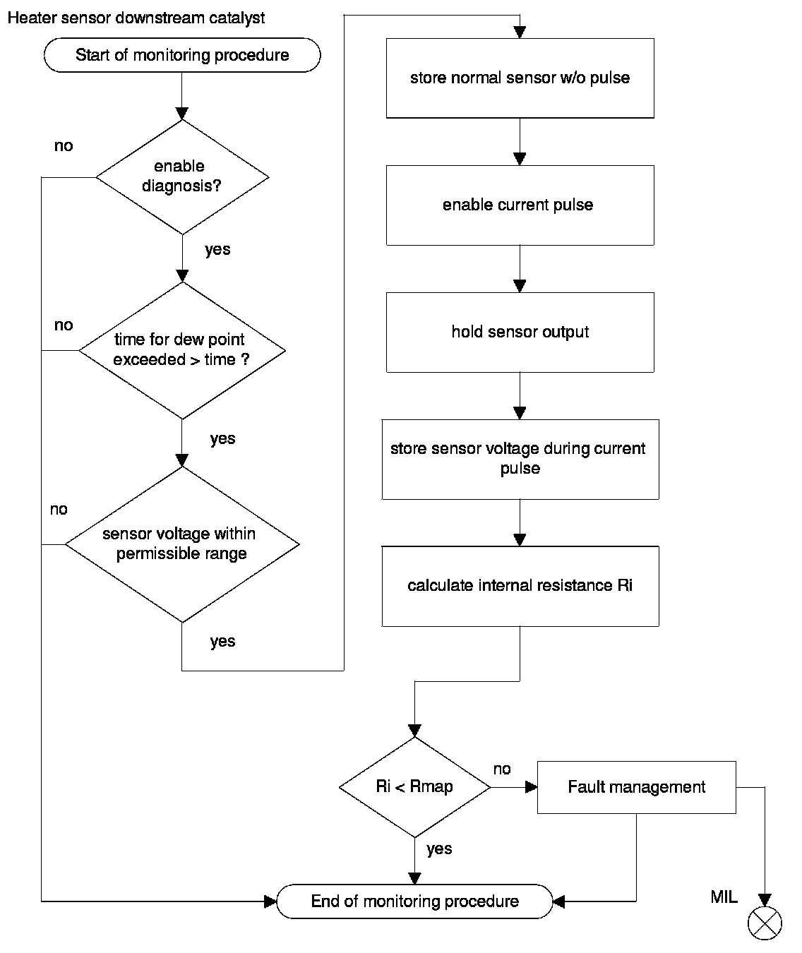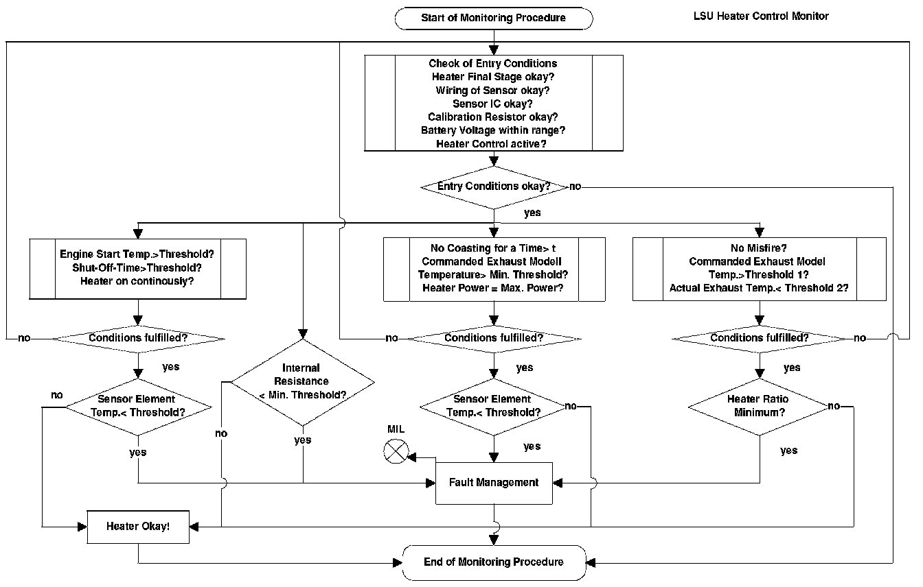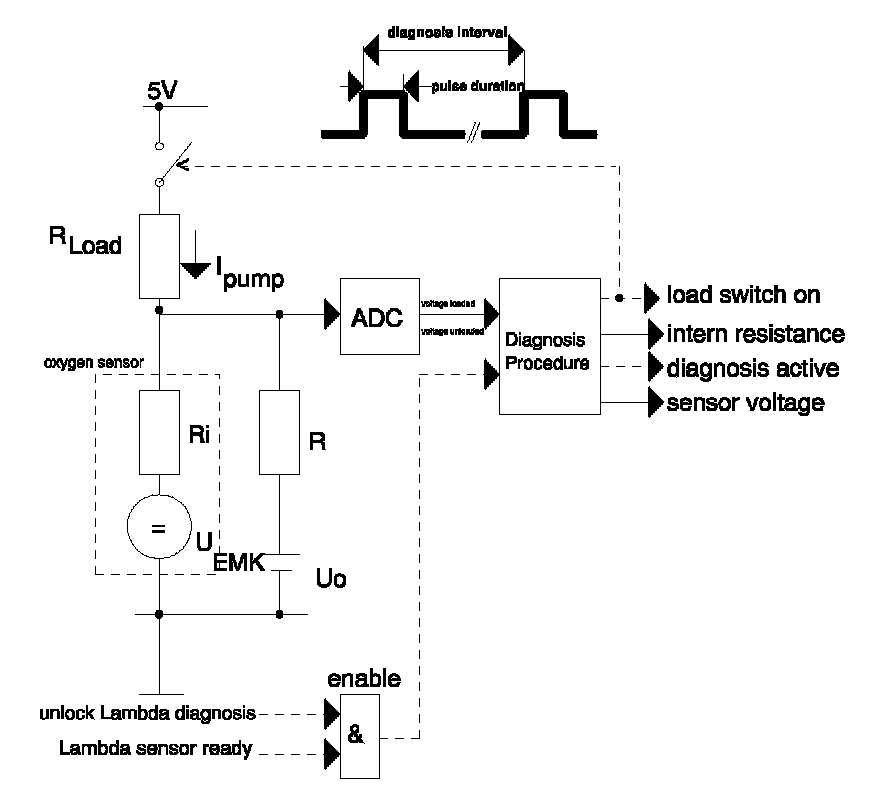 For diagnostic of the sensor heater a specific current pulse is supplied via a load resistance and the voltage is measured. The intern resistance of the sensor heater is calculated with the voltage deviation. The result will be compared with a reference map resistance, which considers aging and sampling deviations. In case of internal resistance > map resistance the diagnosis stores a fault and the MIL will be illuminated.